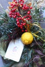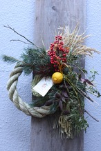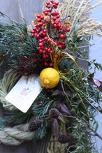赤い南天と黄色の柚子が目を引くしめ縄です。風格のある色使いでお正月にぴったりのしめ縄飾りが出来上がりました。
